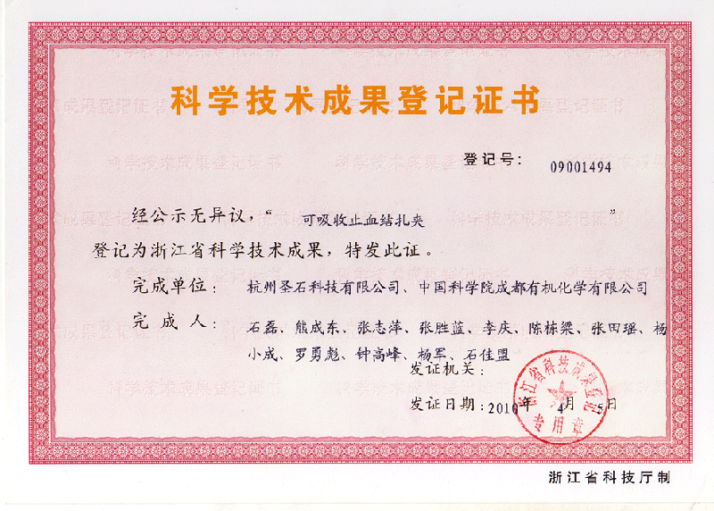 近日,我司研制產(chǎn)品“可吸收止血結(jié)扎夾”獲得浙江省科技廳頒發(fā)的科學(xué)技術(shù)成果登記證書。這一證書的獲得,標(biāo)致著該產(chǎn)品已得到了省級政府部門的認(rèn)可,此舉為我司產(chǎn)品取得更高的榮譽(yù)奠定了堅實的基礎(chǔ)。